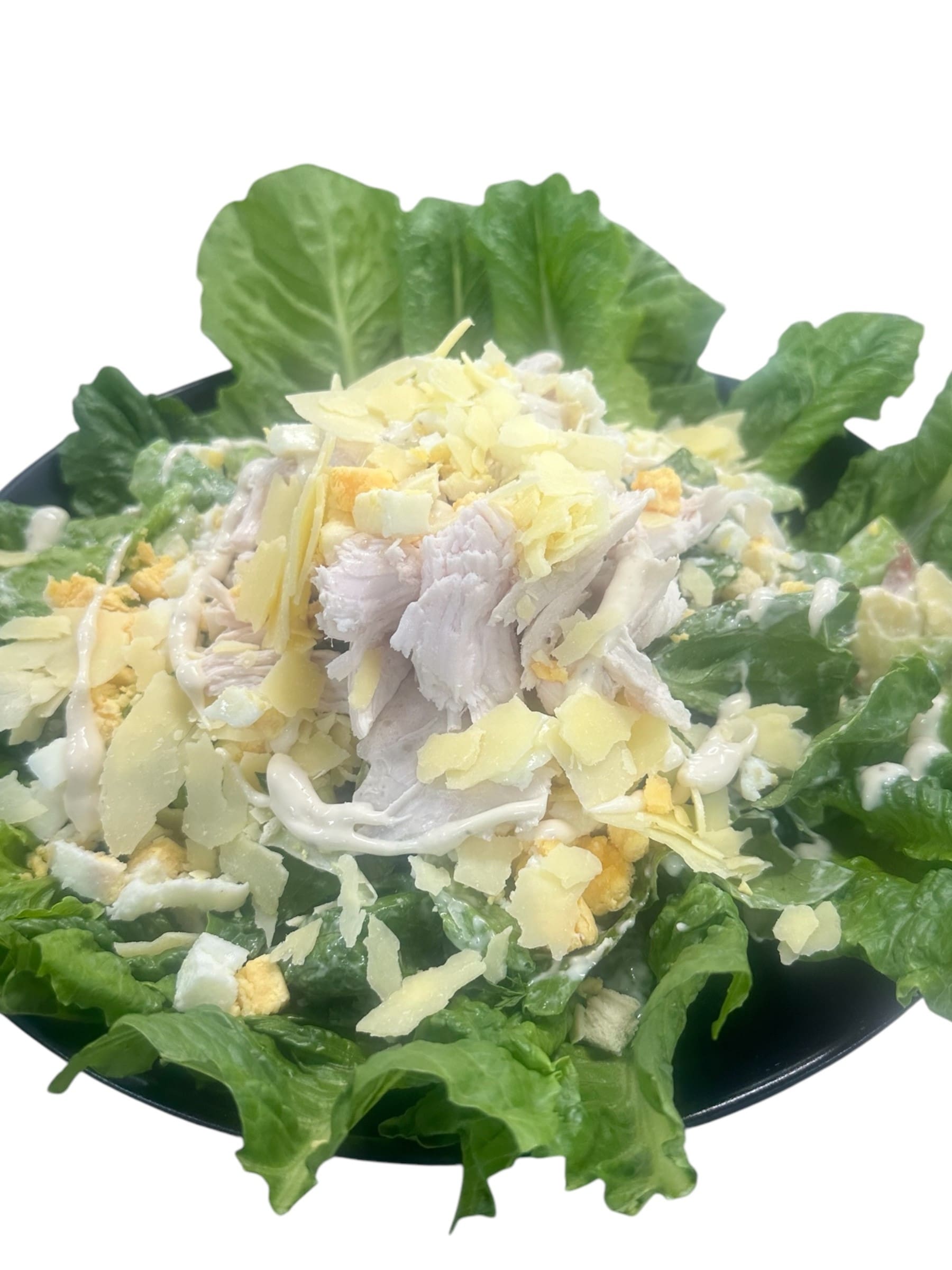 Ingredients: Sous Vide Chicken, Lemon, Thyme, Coz Lettuce, Bacon, Egg, Parmesan Cheese, Bread Croutons, Caesar salad Dressing (includes anchovies, oil, garlic, Worstershire sauce, parmesan cheese.)